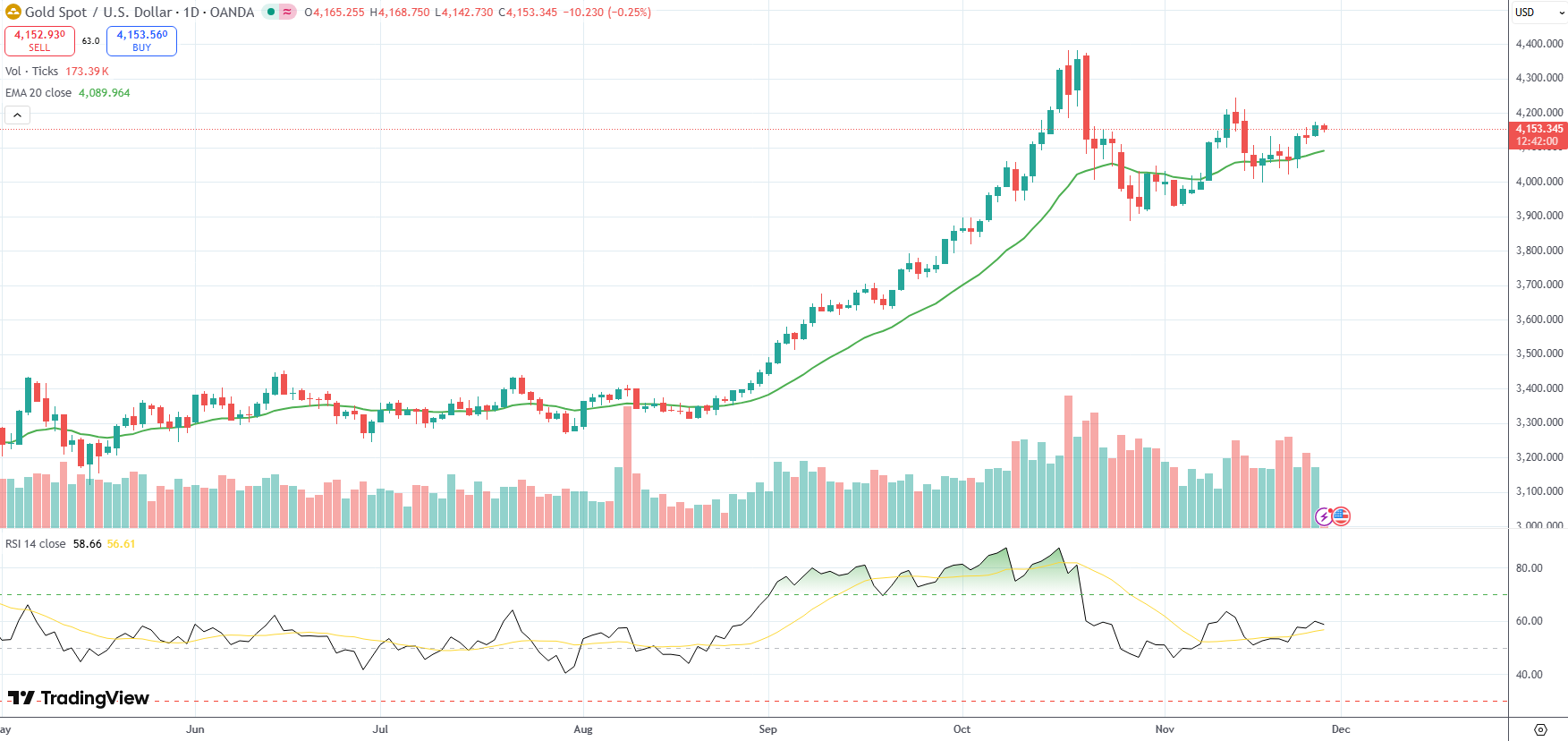 Spot Gold was last down 0.25% on the day to trade at $4,153.34 per troy ounce.
