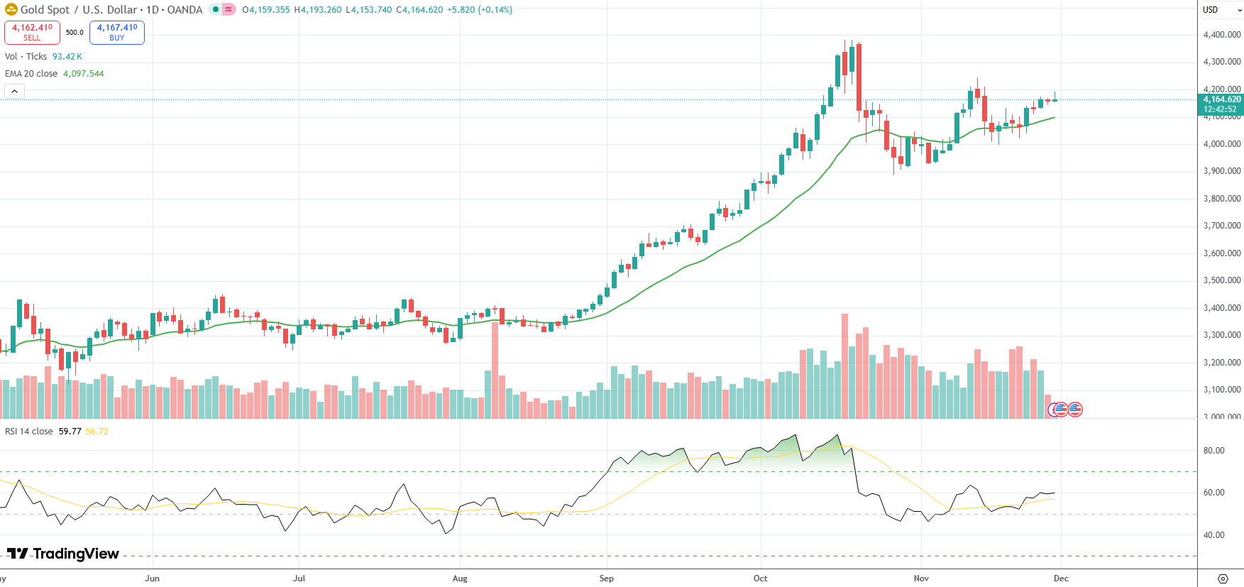 Spot Gold was last up 0.14% on the day to trade at $4,164.62 per troy ounce.