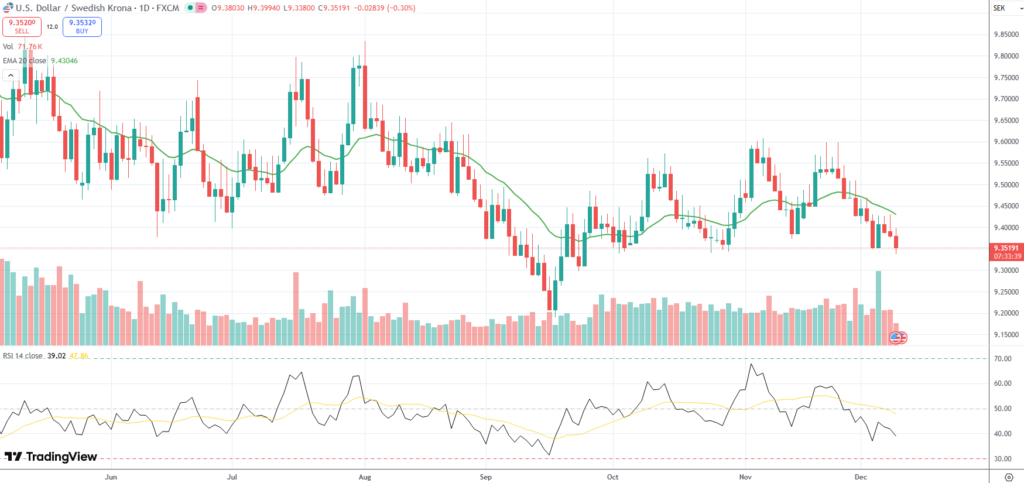 The USD/SEK currency pair was last down 0.30% on the day to trade at 9.3519.
