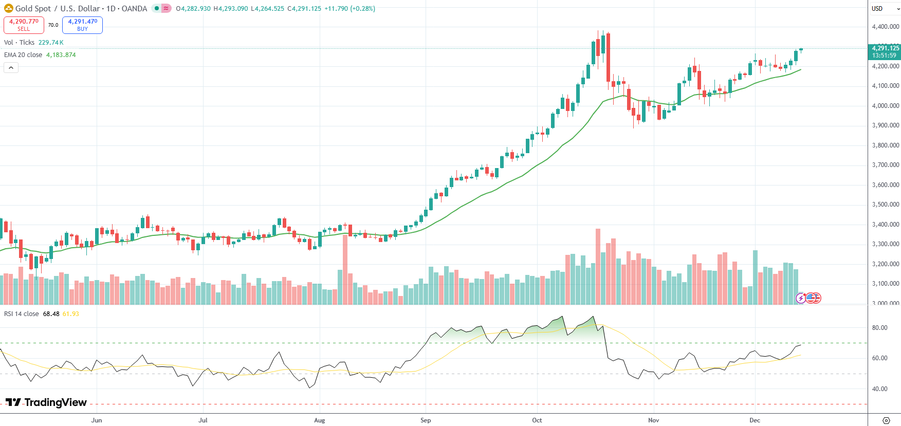 Spot Gold extended gains to a fresh 7 1/2-week high of $4,293.09/oz. on Friday, underpinned by expectations of further policy easing by the Federal Reserve.