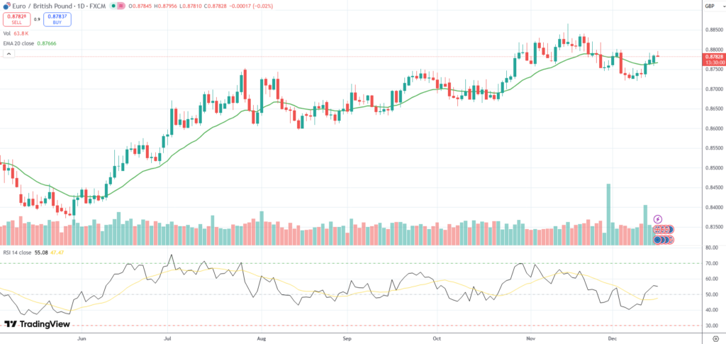 The EUR/GBP currency pair held near a two-week high of 0.8795 on Tuesday ahead of the outcome of the European Central Bank’s and the Bank of England’s policy meetings.