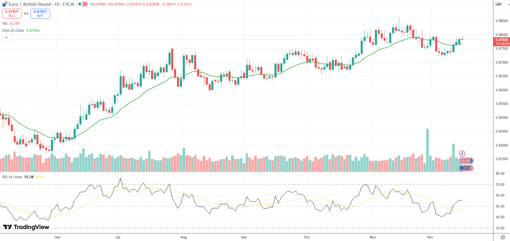 The EUR/GBP currency pair was last little changed on the day to trade at 0.8783.