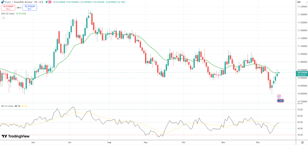The EUR/SEK currency pair was last up 0.10% on the day to trade at 10.9345.