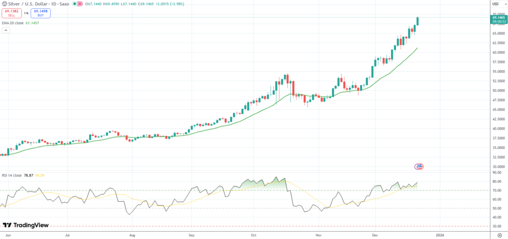 Spot Silver scaled a fresh record high of $69.44/oz. on Monday, underpinned by expectations of further policy easing by the Federal Reserve and amid ongoing supply deficit, rising industrial demand as well as robust investment demand.