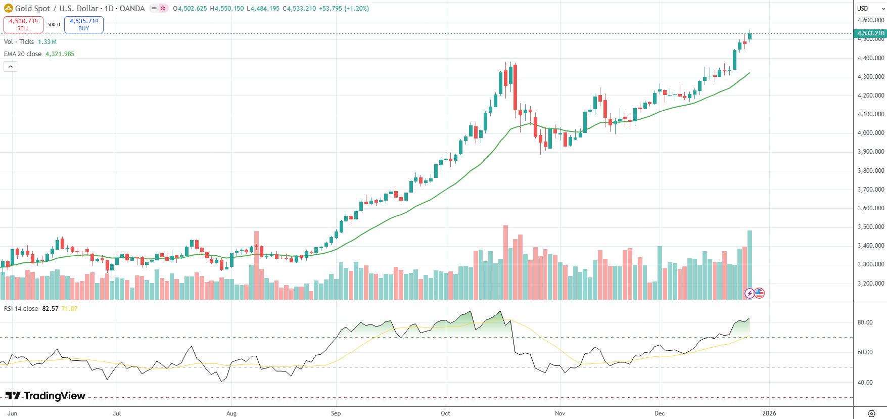 Year-to-date, the yellow metal has surged 72.74%, set to register its best annual performance since 1979. Its weekly gain was 4.48%.