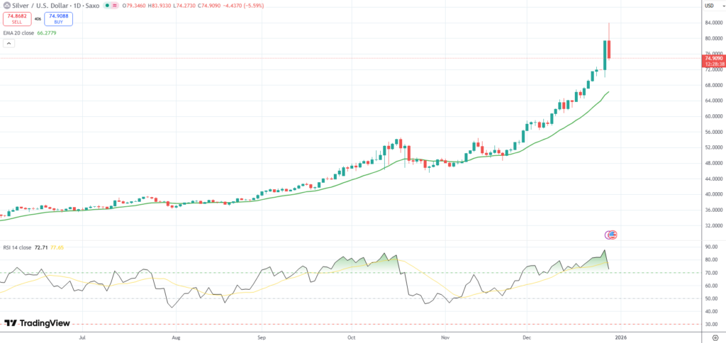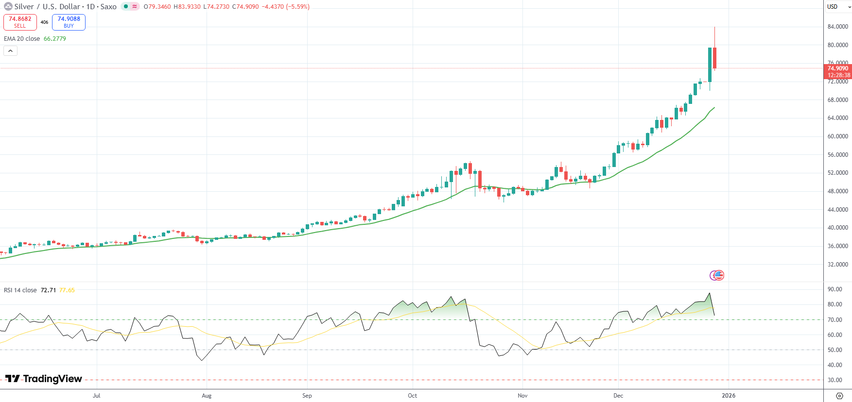 Spot Silver pulled back from a fresh all-time high of $83.62/oz. on Monday, as investors likely took profits following the recent sharp rally and after seemingly productive talks between Donald Trump and Volodymyr Zelenskiy on a potential peace deal.
