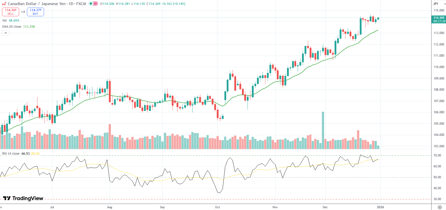 The CAD/JPY currency pair held in proximity to recent high of 114.63, its strongest level since July 22nd 2024, in thin year-end trade, with investors weighing central bank policy outlook.