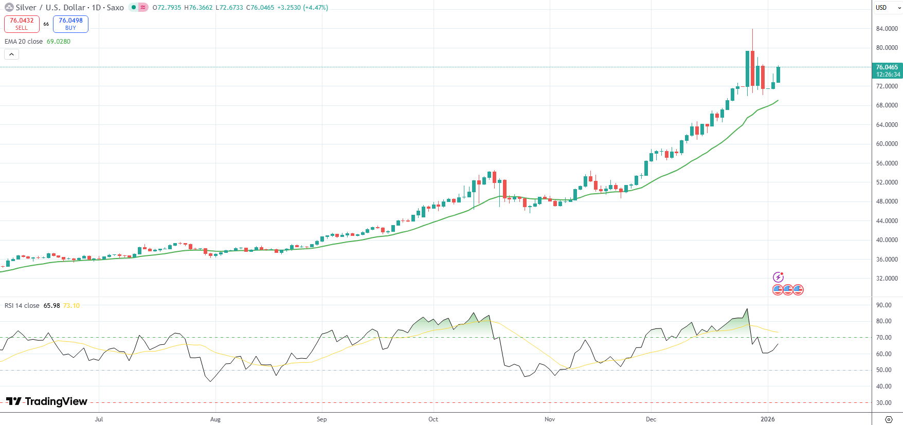 Spot Silver was last up 4.47% on the day to trade at $76.05 per troy ounce.