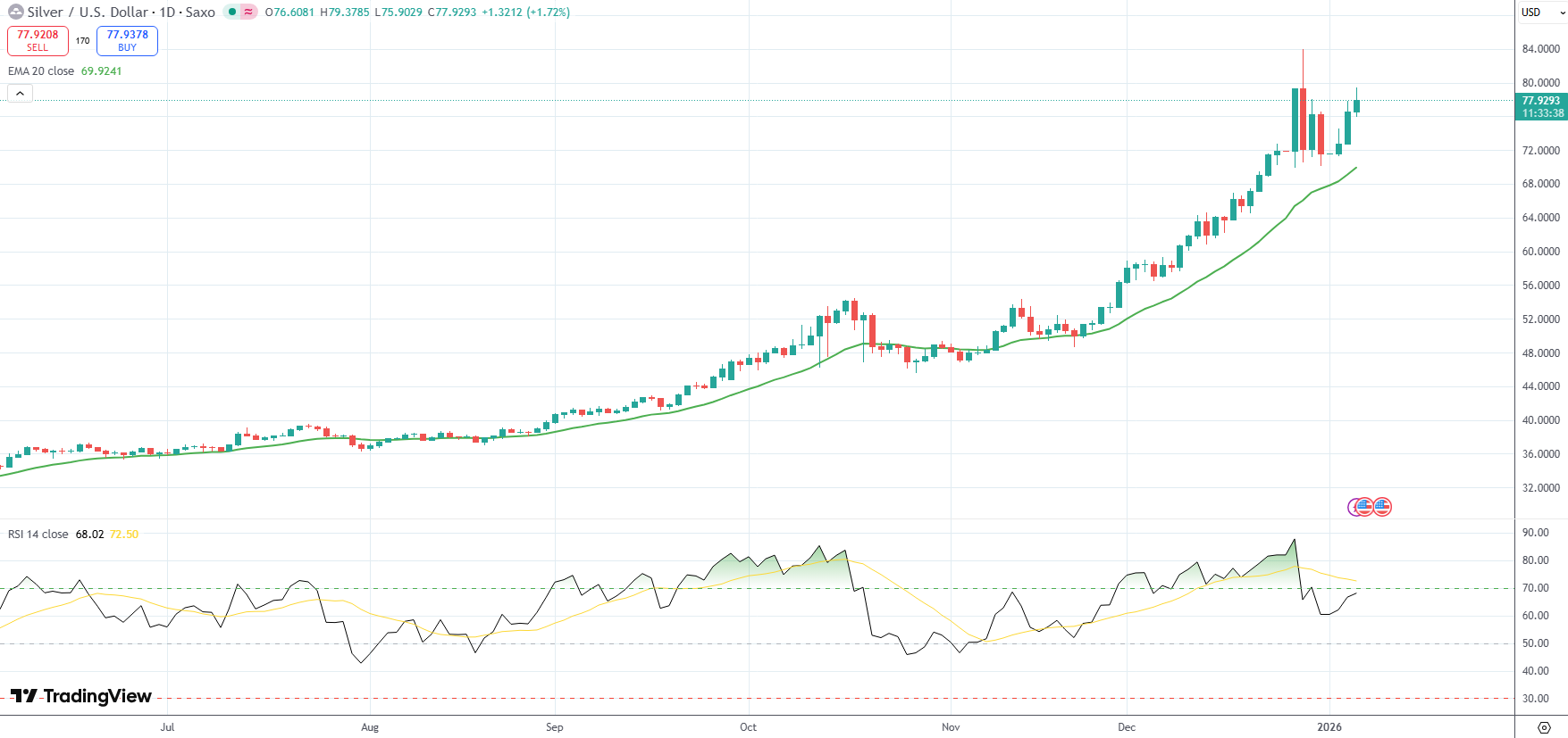 Spot Silver was last up 1.72% on the day to trade at $77.93 per troy ounce.