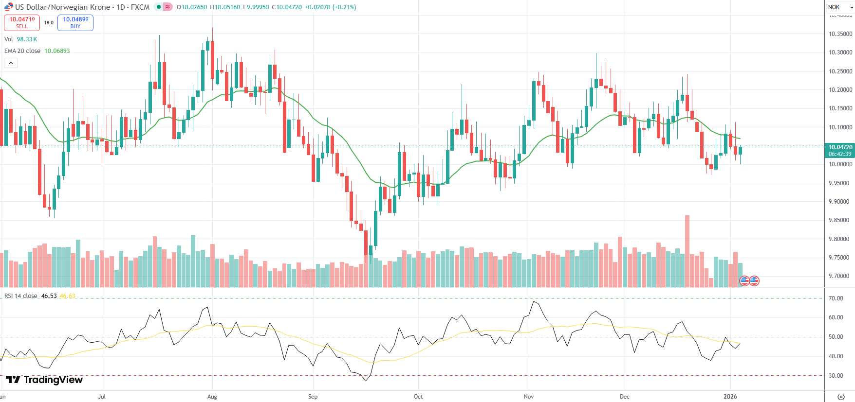 The USD/NOK currency pair hovered above a one-week low of 9.9995 on Tuesday, as the greenback was weighed down by dovish remarks by a key Federal Reserve official, which bolstered investor rate cut optimism.