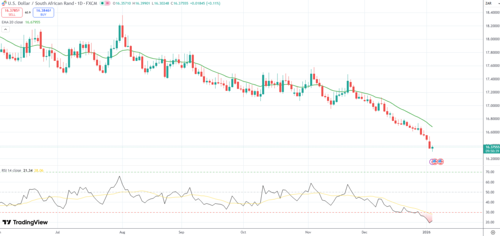 The USD/ZAR currency pair hovered above a fresh low of 16.3025, its weakest level since August 15th 2022, as the greenback was weighed down by dovish remarks by a key Federal Reserve official, which bolstered investor rate cut expectations.
