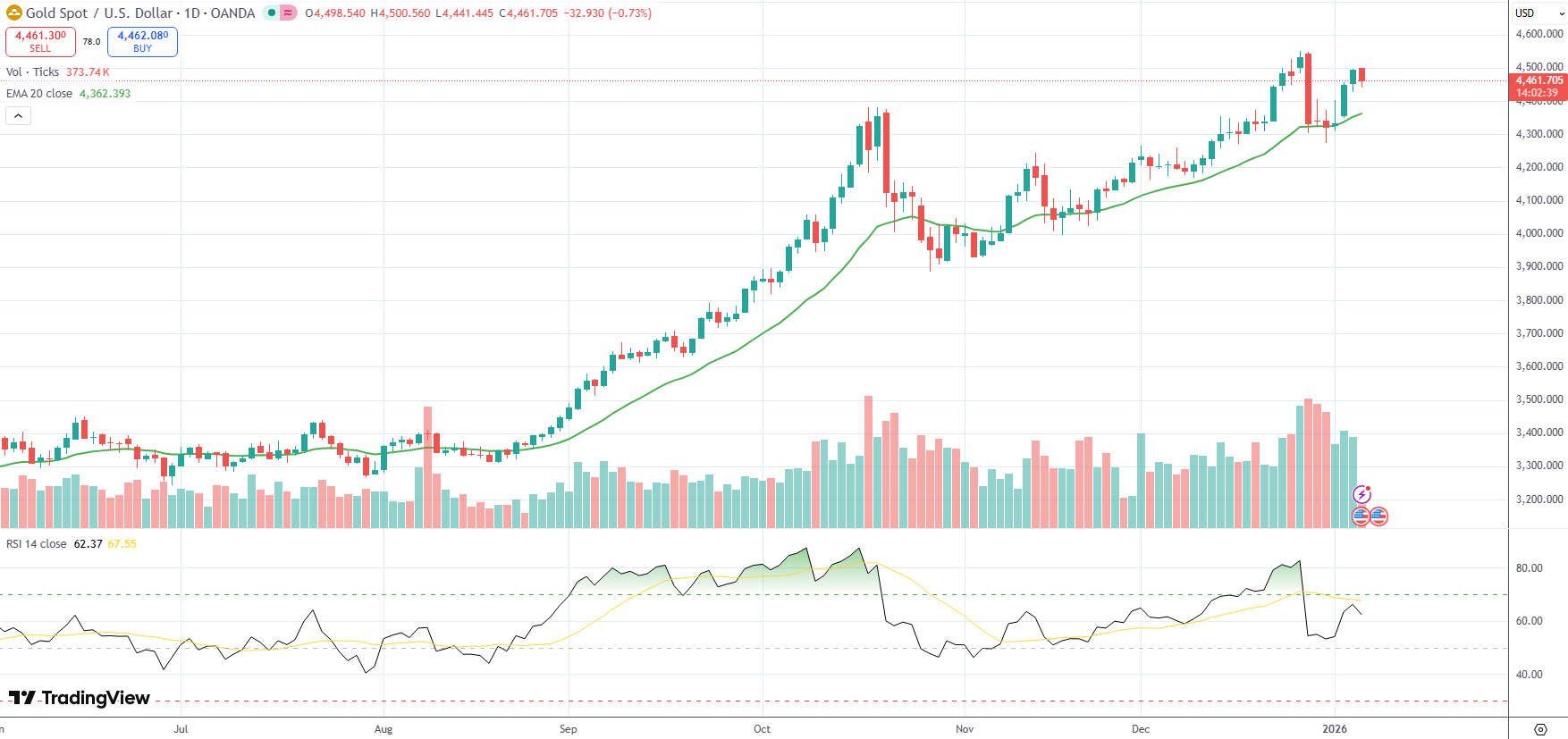 Spot Gold was last down 0.73% on the day to trade at $4,461.70 per troy ounce.
