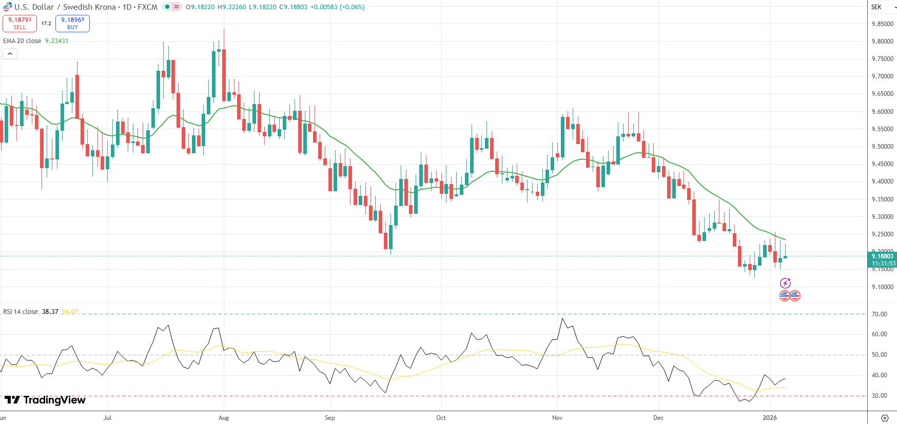 The USD/SEK currency pair was last up 0.06% on the day to trade at 9.1880.