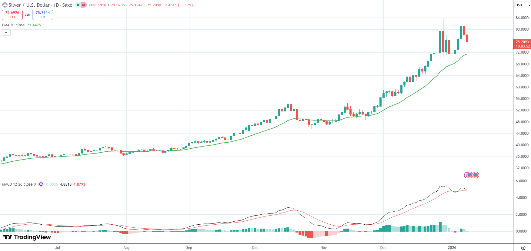 Spot Silver was last down 3.17% on the day to trade at $75.71 per troy ounce.