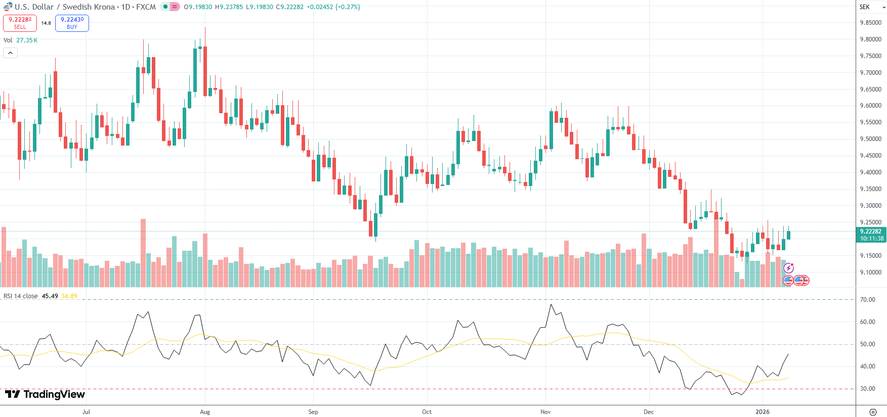 The USD/SEK currency pair was last up 0.27% on the day to trade at 9.2228.