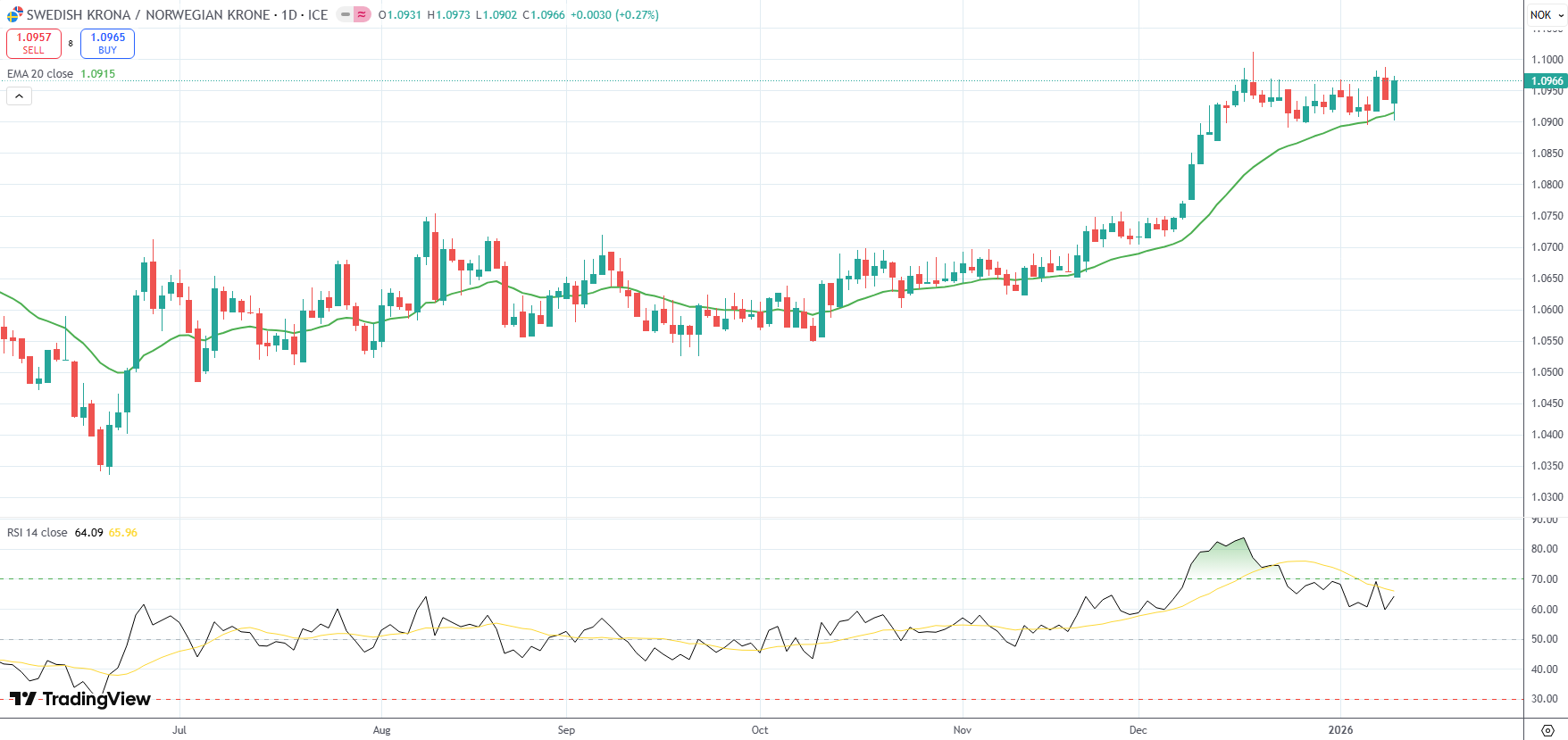 The SEK/NOK currency pair settled below recent high of 1.0987, its strongest level since December 18th, in the wake of local macro data releases.
