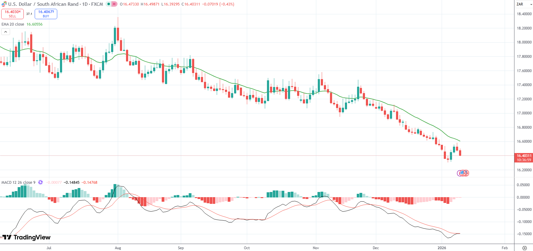 The USD/ZAR currency pair was last down 0.43% on the day to trade at 16.4031.