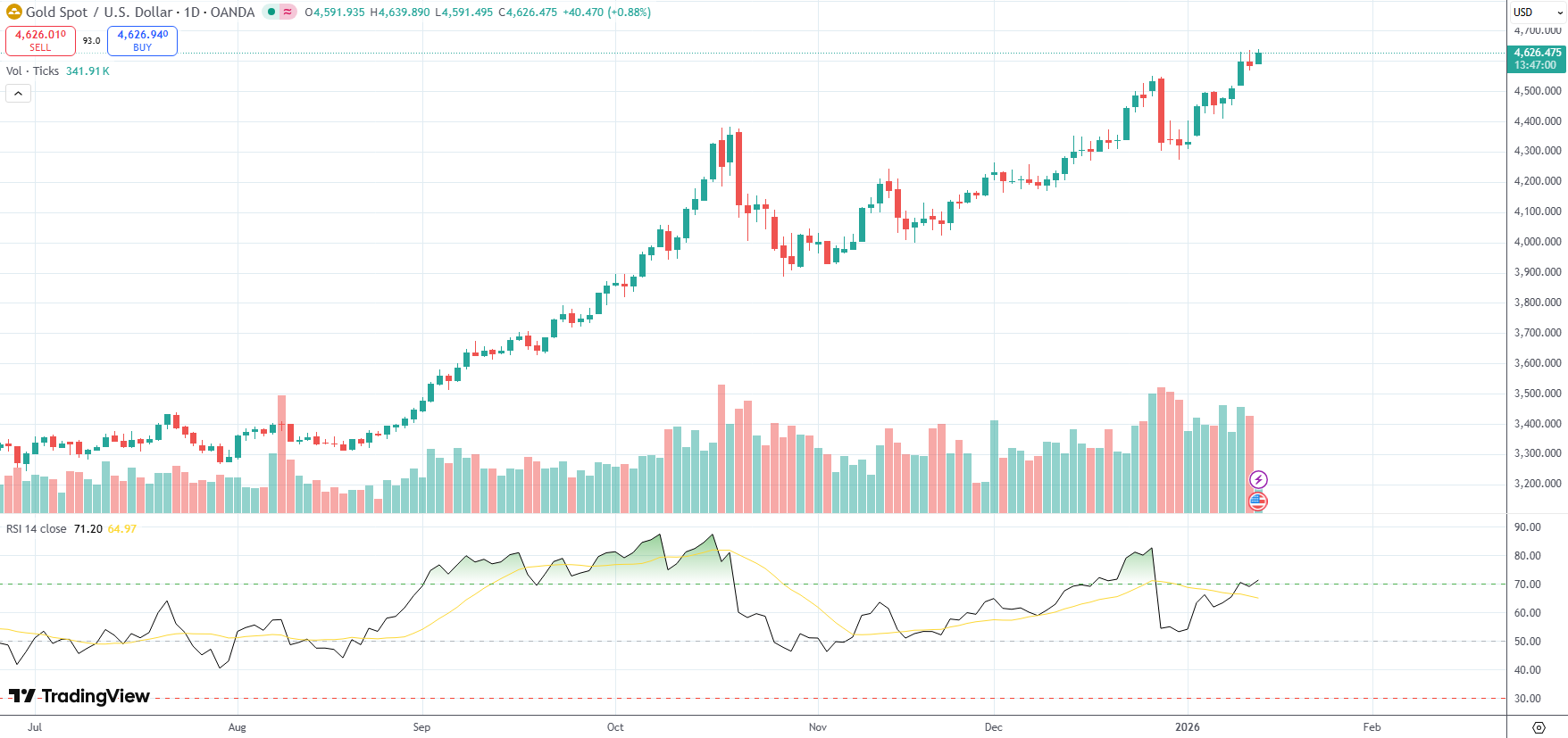 Spot Gold was last up 0.88% on the day to trade at $4,626.47 per troy ounce.