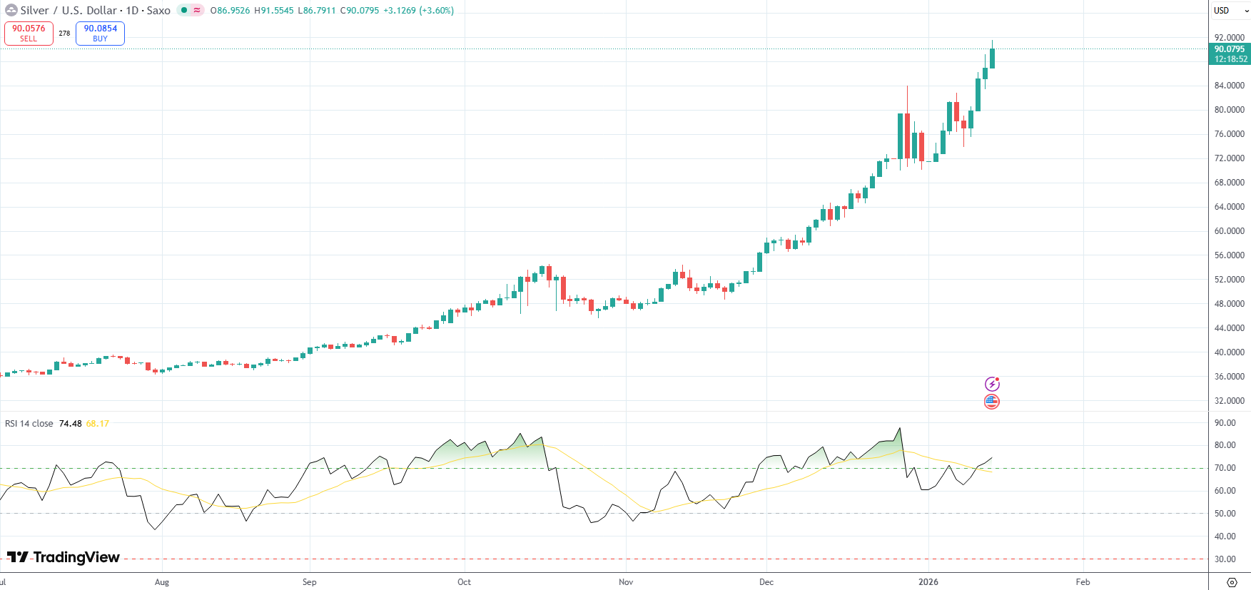 Spot Silver was last up 3.60% on the day to trade at $90.08 per troy ounce.