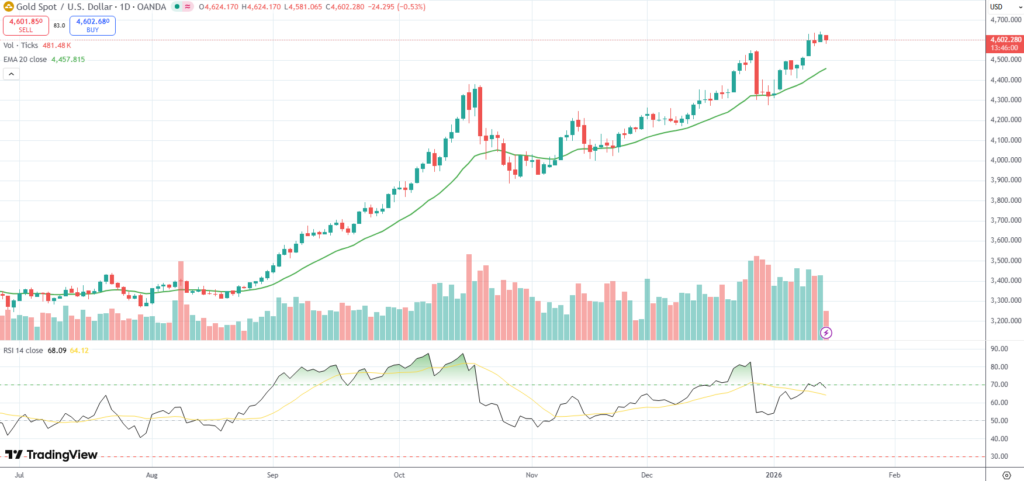 Spot Gold eased from recently achieved all-time high of $4,642.72/oz. on Thursday, as market players likely booked profits after recent rally.