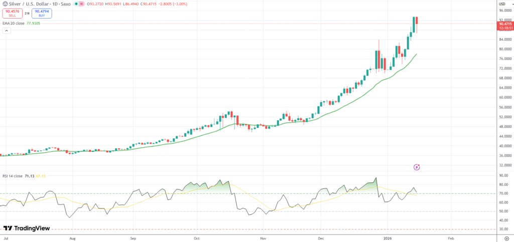 Spot Silver pulled back from a record high level of $93.56/oz. on Thursday, after the Trump administration abstained from imposing new tariffs targeting imports of critical minerals.