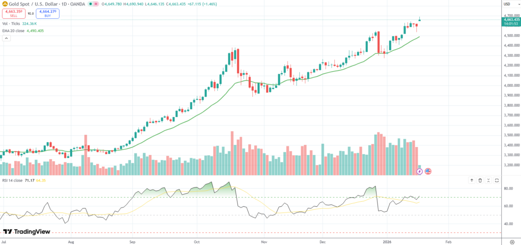 Spot Gold soared to a fresh all-time high of $4,689.39/oz. on Monday, as US President Donald Trump’s new tariff threats over Greenland re-ignited safe-haven demand.