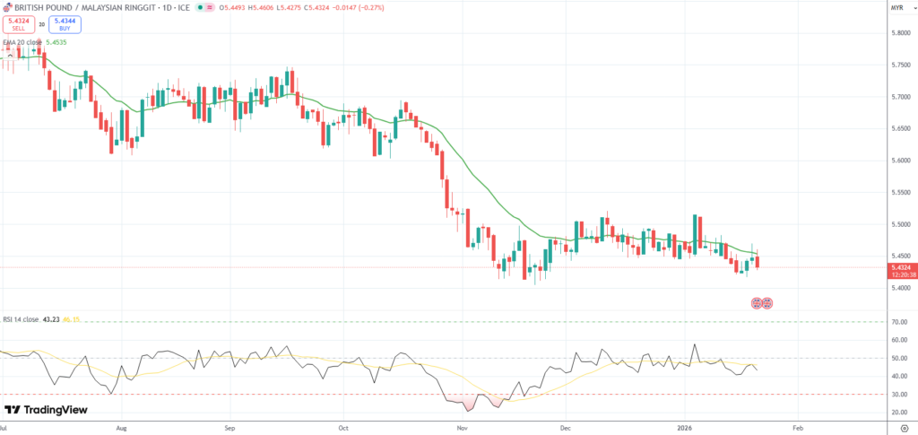 The GBP/MYR currency pair was last down 0.27% on the day to trade at 5.4324.
