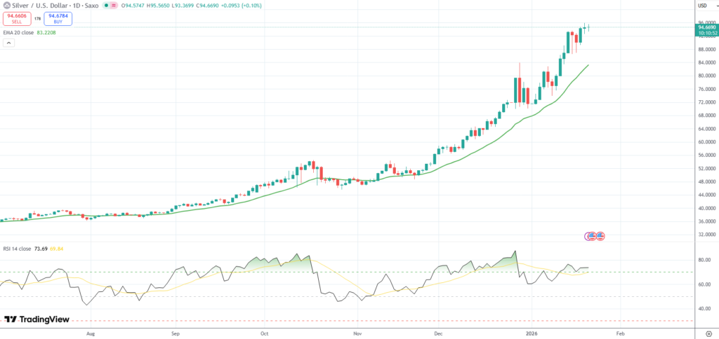 Spot Silver held within striking distance of an all-time high of $95.87/oz. on Wednesday amid simmering tensions between the US and Europe over US President Donald Trump’s push to take over Greenland.
