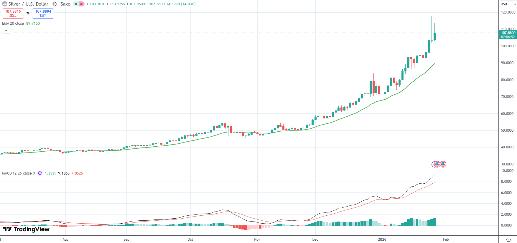 Spot Silver held in proximity to an all-time high of $117.69/oz. on Tuesday amid persistent geopolitical tensions, a crisis of confidence in the US administration and broader economic uncertainty.