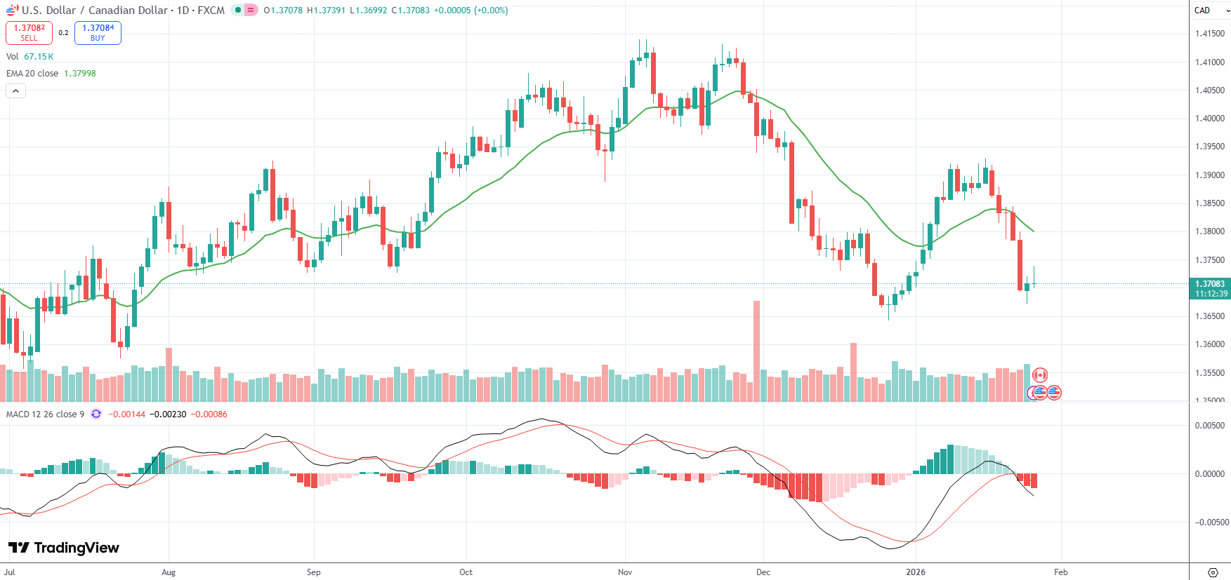 The USD/CAD currency pair was last flat on the day to trade at 1.3708.