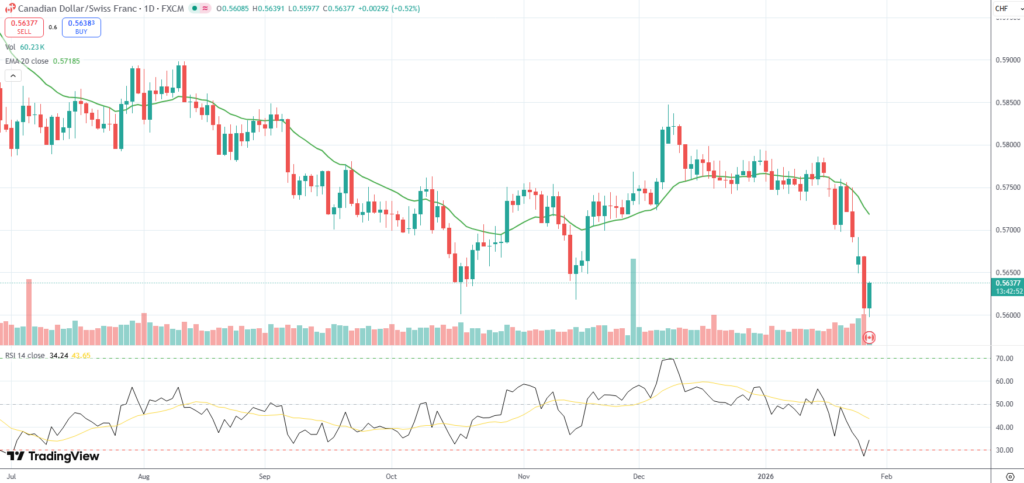 The CAD/CHF currency pair rebounded from a fresh low of 0.5598, its weakest level on record, on Wednesday ahead of the outcome of the Bank of Canada’s policy meeting later today.