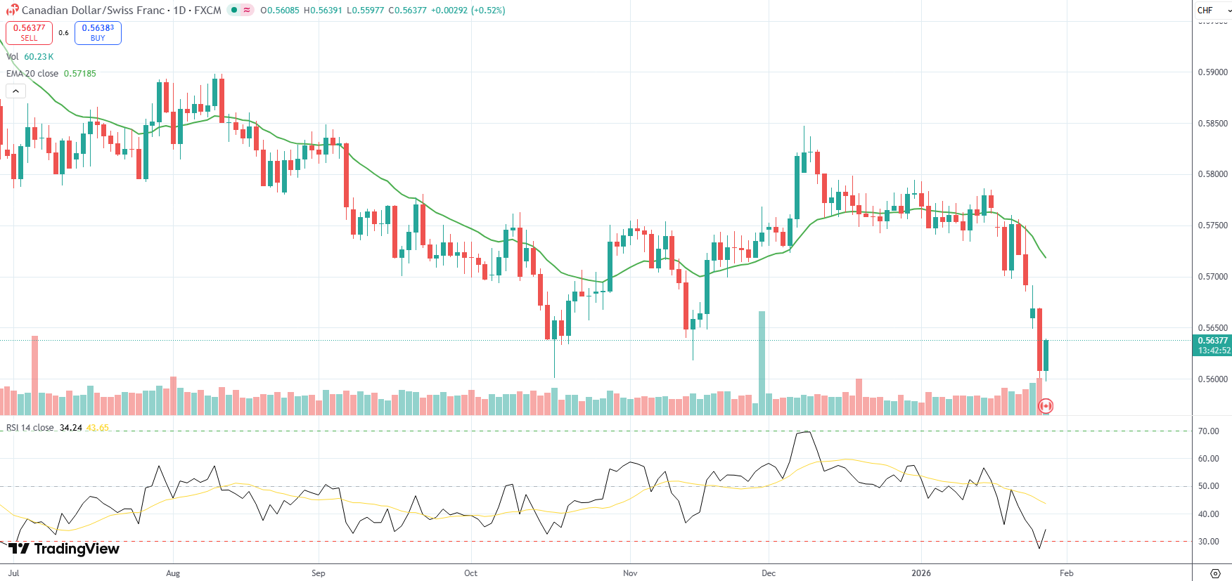 The CAD/CHF currency pair was last up 0.52% on the day to trade at 0.5637.