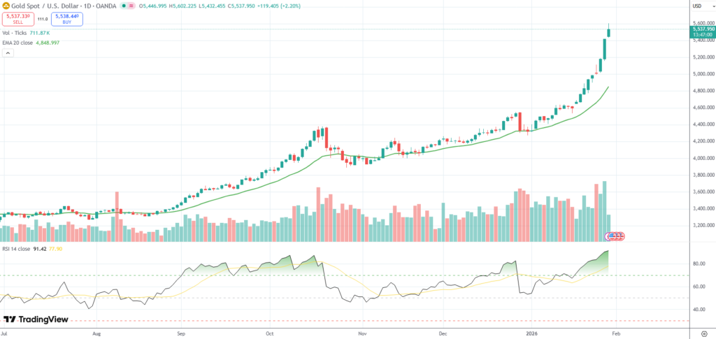 Spot Gold extended its rally to a new record high above $5,550/oz. on Thursday amid continued US Dollar weakness, persistent geopolitical tensions and broader economic uncertainty.