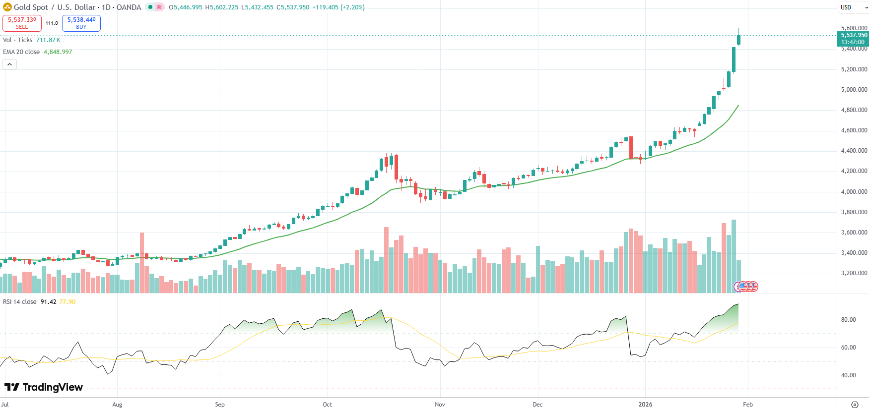 Spot Gold was last up 2.20% on the day to trade at $5,537.95 per troy ounce.