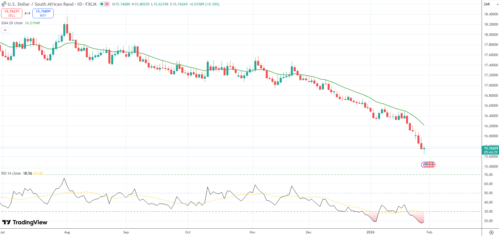 The USD/ZAR currency pair was last up 0.10% on the day to trade at 15.7627.