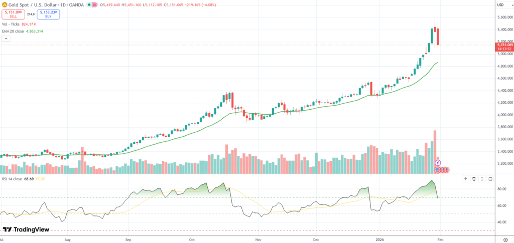 Spot Gold was last down 4.08% on the day to trade at $5,151.06 per troy ounce.