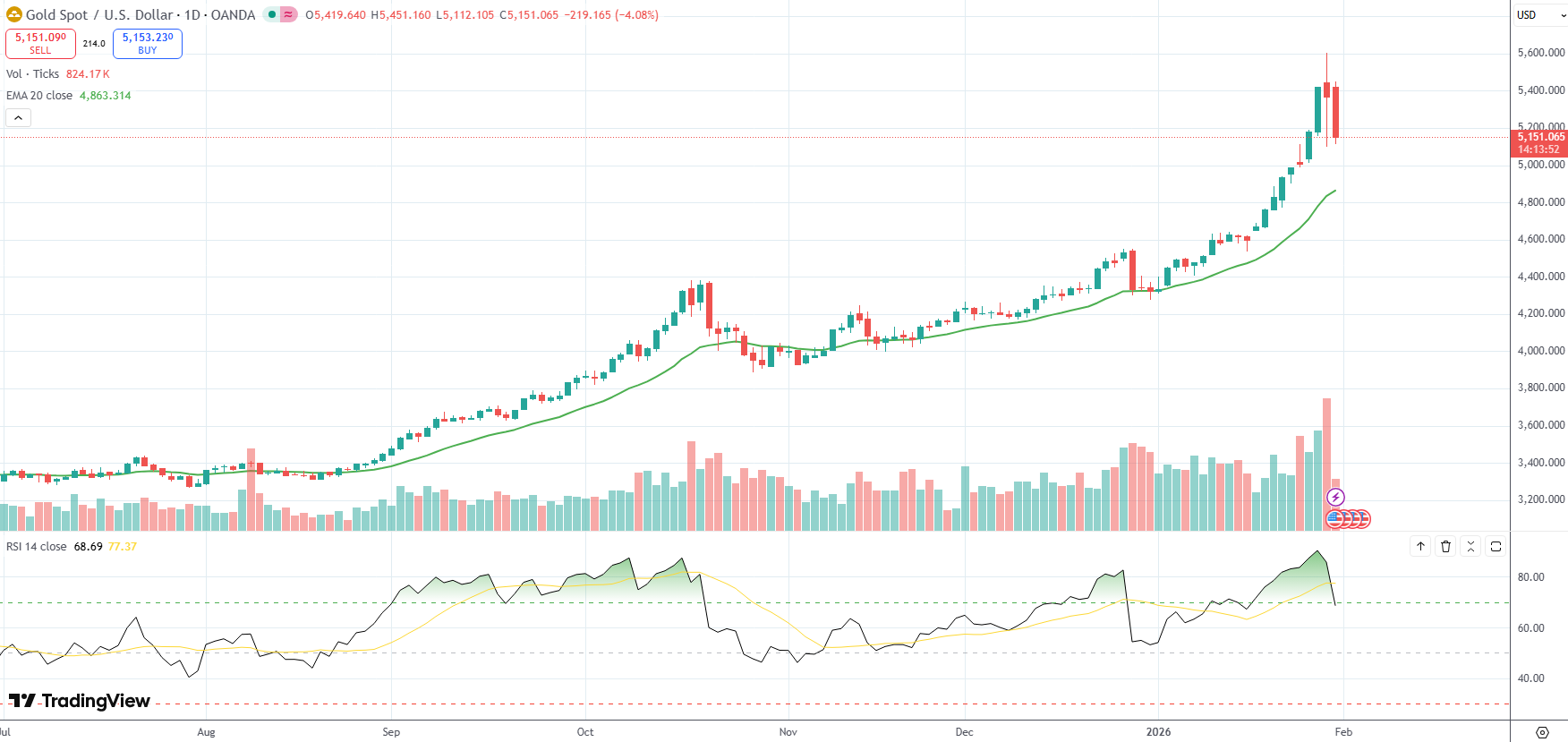 Spot Gold pulled back from a record high of $5,594.82/oz. on Friday, retreating more than 4% on the day, amid market speculation that the next Federal Reserve Chair could adopt a more hawkish policy approach.