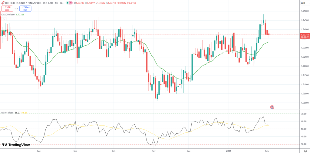 The GBP/SGD currency pair was last flat on the day to trade at 1.7372.