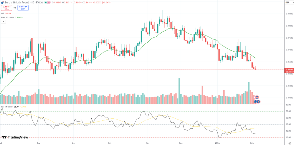 The EUR/GBP currency pair was last down 0.04% on the day to trade at 0.8618.