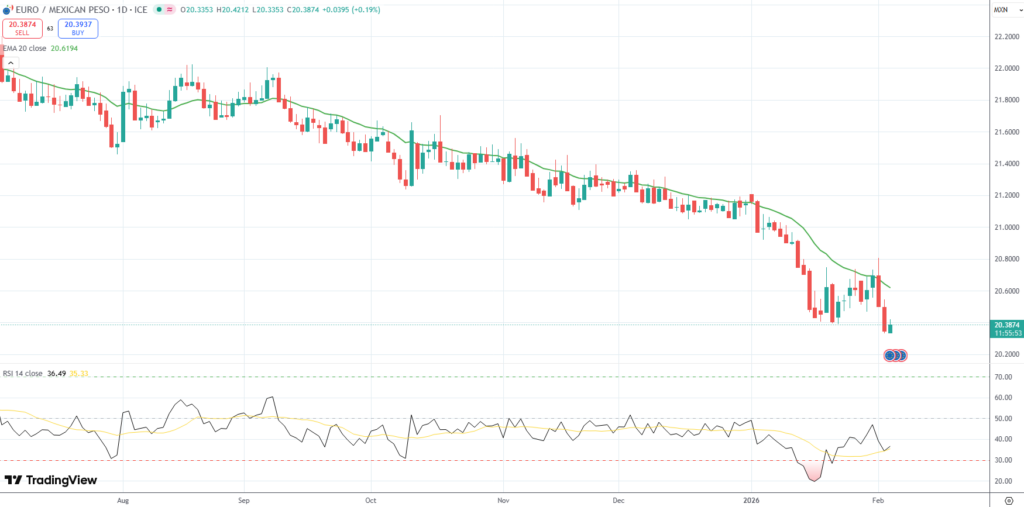 The EUR/MXN currency pair hovered above a fresh low of 20.3304, its weakest level since August 1st 2024, ahead of the outcome of the European Central Bank’s and the Mexican central bank’s policy meetings.