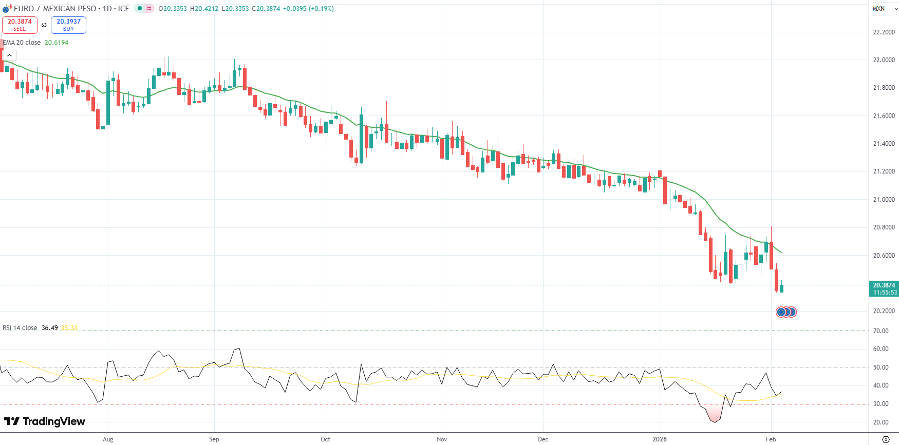 The EUR/MXN currency pair was last up 0.19% on the day to trade at 20.3874.