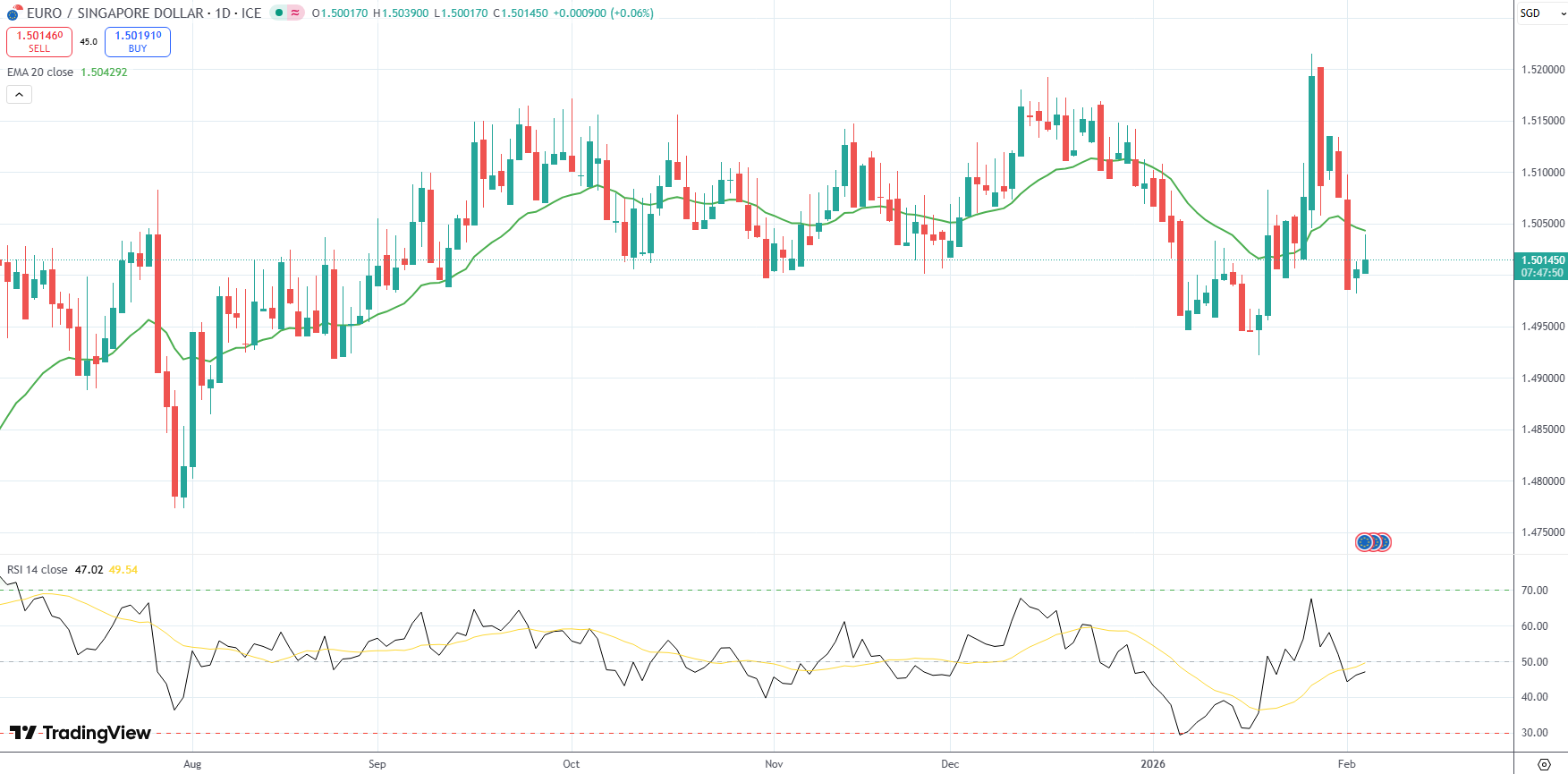 The EUR/SGD currency pair was last up 0.06% on the day to trade at 1.5014.