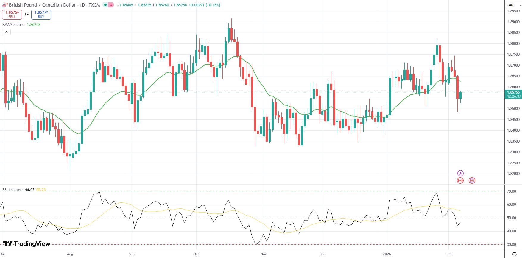 The GBP/CAD currency pair was last up 0.16% on the day to trade at 1.8575.
