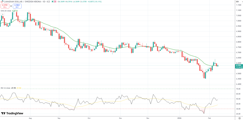The CAD/SEK currency pair was last up 0.11% on the day to trade at 6.5781.