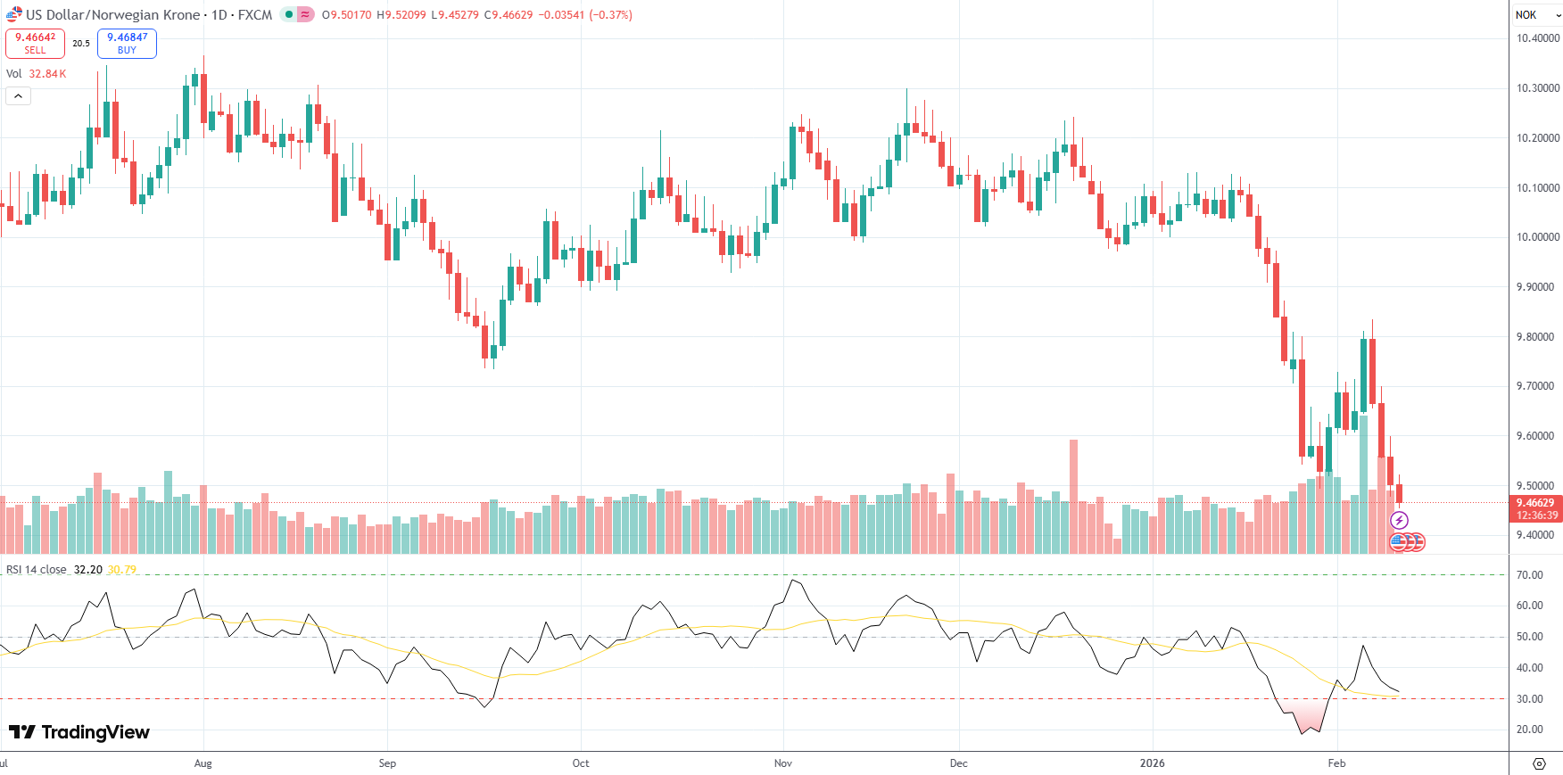 The USD/NOK currency pair was last down 0.37% on the day to trade at 9.4663.