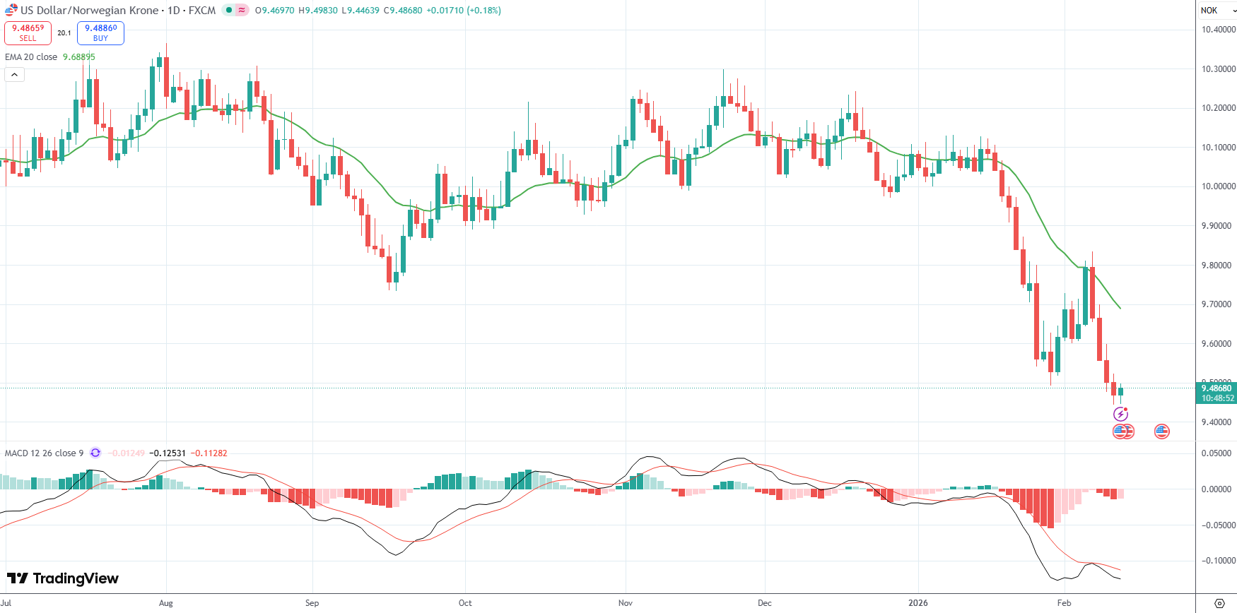 The USD/NOK currency pair was last up 0.18% on the day to trade at 9.4868.