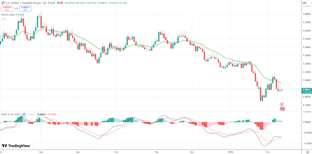 The USD/SEK currency pair was last up 0.14% on the day to trade at 8.8881.
