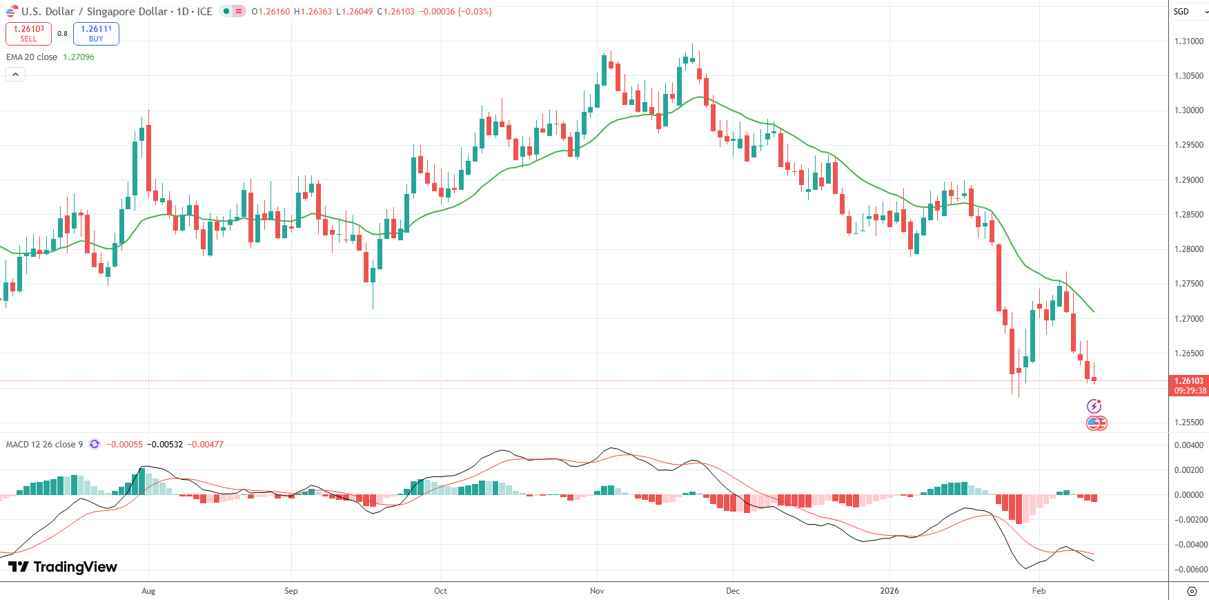 The USD/SGD currency pair was last little changed on the day to trade at 1.2610.
