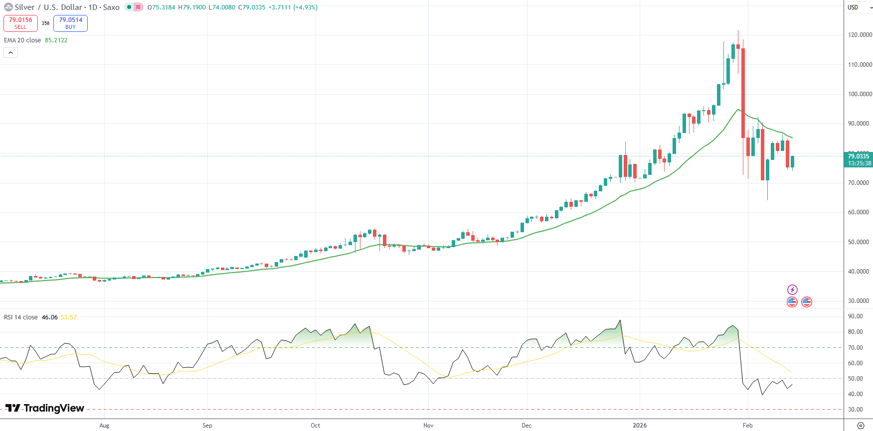 Spot Silver was last up 4.93% on the day to trade at $79.03 per troy ounce.