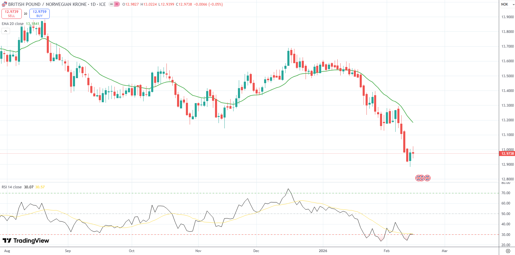 The GBP/NOK currency pair settled above recent low of 12.8820, its weakest level since December 27th 2023, as soft UK GDP growth added to Bank of England rate cut expectations.